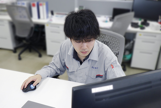 私の部署は、当社が請け負ったプラント建設における電気設計、電気工事施工管理を担当しています。電気設計は受配電設備の設計、電動機の動力配線、操作スイッチ等の制御配線、照明配置、避雷設備の配置等多岐に渡ります。とりわけ新規プラント建設では高圧受電等の電源上位側から、現場電動機までの配線までプラント全体の電気設計を行うことになります。当社の電気設計担当は幅広い業務に携わりますが、一人のエンジニアがプラントの電気設備全てを担当するため、電気設計に関する全般知識を身につけることができます。